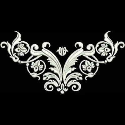 This digital machine embroidery design features intricate floral motifs and elegant swirling vines, featuring delicate detailing and a symmetrical arrangement. Available in all hoop sizes.