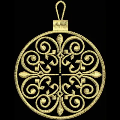 This digital machine embroidery design features an intricate circular pattern featuring elegant swirls and pointed motifs, rendered in a golden thread. Available for 4X4 hoops.