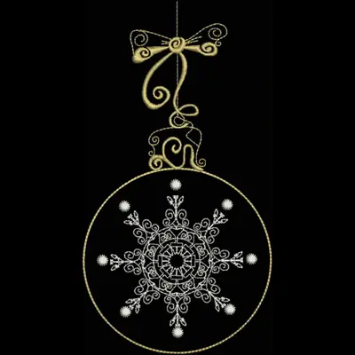 This digital machine embroidery design features an ornate snowflake pattern within a circular ornament, embellished with a decorative bow at the top. Available for 5X7 hoops.