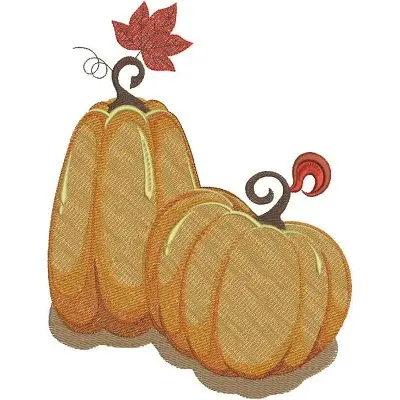 This digital machine embroidery design features two decorative pumpkins with curly stems and a small autumn leaf. Available in all hoop sizes.