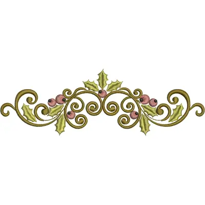 This embroidery design features a decorative scroll featuring holly leaves and berries in rich greens and subtle pinks. Available for 5X7 hoops.
