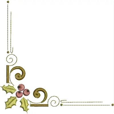 This embroidery design features a decorative corner featuring holly leaves and berries with elegant swirls and curves. Available for 5X7 hoops.