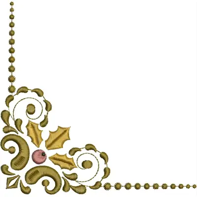 This digital machine embroidery design features an elegant corner motif featuring swirling patterns, holly leaves, and berries in earthy tones. Available for 5X7 hoops.