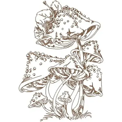 This digital machine embroidery design features intricately detailed mushrooms, showcasing various shapes and sizes with textured caps and stems. Available in all hoop sizes.