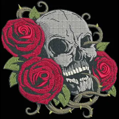 This digital machine embroidery design features a skull surrounded by three vibrant red roses and lush green leaves, featuring intricate detailing. Available in all hoop sizes.