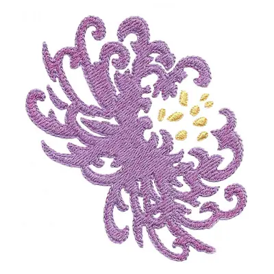 An embroidery design of intricate swirling lavender shapes with golden accents resembling petals radiating from the center..
