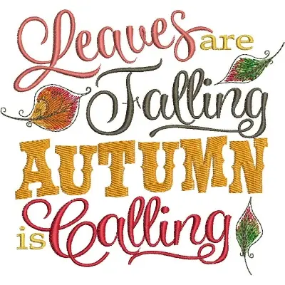 This digital machine embroidery design features the phrase "Leaves are Falling, AUTUMN is Calling" with colorful lettering and decorative leaf elements. Available in all hoop sizes.