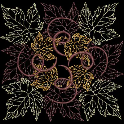 This digital machine embroidery design features intricate autumn leaves arranged in a circular pattern, complemented by elegant flowing lines. Available for 5X5 hoops.