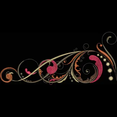 An embroidery design of intricate swirls and floral elements in vibrant colors, showcasing a blend of curves and loops.