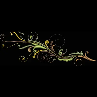 This digital machine embroidery design features intricate swirling vines and leaves in shades of green, yellow, and brown, accentuated by delicate spirals and small decorative elements. Available in all hoop sizes.