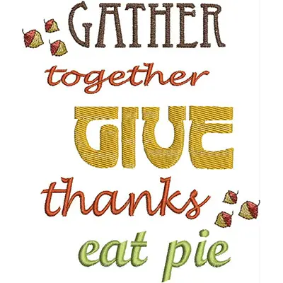 This digital machine embroidery design features the words "Gather together, Give thanks, eat pie" in a playful mix of colors and fonts. Available in all hoop sizes.
