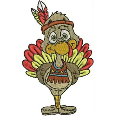 An embroidery design of a cheerful turkey wearing a colorful feathered headdress and a festive outfit.