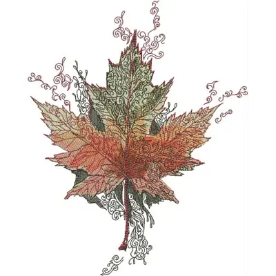This digital machine embroidery design features a detailed and colorful maple leaf featuring intricate line work and decorative swirls. Available in all hoop sizes.