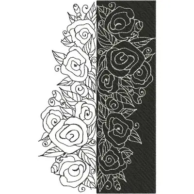 This digital machine embroidery design features a contrasting arrangement of roses, with one side featuring outlined roses and the other side showcasing filled roses, each accompanied by swirling leaves. Available in all hoop sizes.