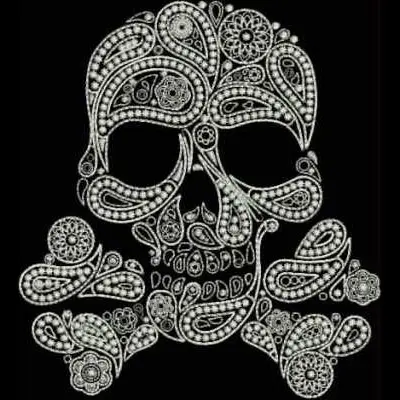 This digital machine embroidery design features an ornately decorated skull featuring intricate patterns and floral motifs. Available in all hoop sizes.