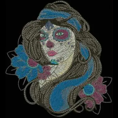 This digital machine embroidery design features a stylized female figure adorned with vibrant floral accents and intricate hair detailing. Available in all hoop sizes.