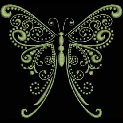 This digital machine embroidery design features an ornate butterfly featuring intricate swirls and dot patterns in a soft green hue. Available for 5X7 hoops.