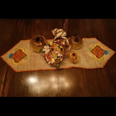 This digital machine embroidery design features vibrant autumn leaves and pumpkins, showcased on a decorative fabric piece with intricate borders. Available for 8X12- hoops.