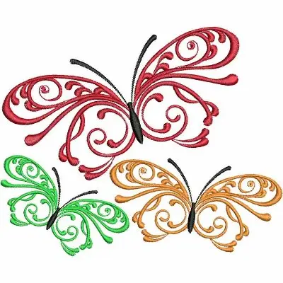This embroidery design features three intricately detailed butterflies in red, green, and orange, featuring elegant swirls and patterns. Available in all hoop sizes.