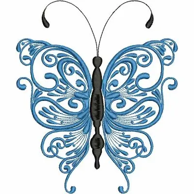 This digital machine embroidery design features a beautifully intricate butterfly with swirling blue patterns and a black body. Available in all hoop sizes.