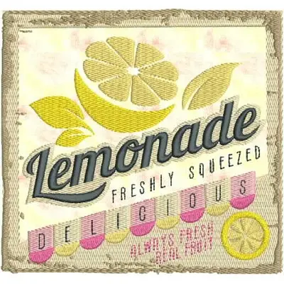 This digital machine embroidery design features a colorful lemonade theme featuring the words "Lemonade," "Freshly Squeezed," and "Delicious," along with lemon graphics. Available in all hoop sizes.