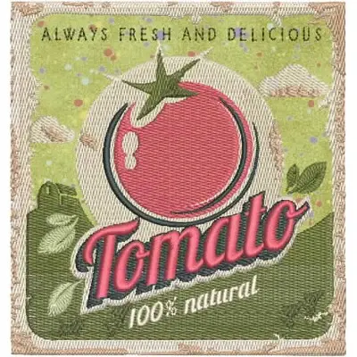 This digital machine embroidery design features a vibrant red tomato with the word "Tomato" in a bold, stylized font, accompanied by the phrase "100% natural" in a fun and playful manner. Available in all hoop sizes.