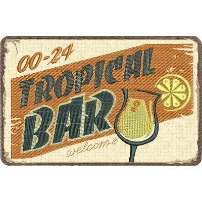 This digital machine embroidery design features a sign featuring the text "Tropical Bar" alongside a stylized cocktail glass and a slice of lemon, conveying a welcoming vibe. Available in all hoop sizes.
