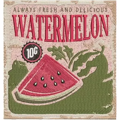 This embroidery design features a watermelon slice with the text "Always Fresh and Delicious Watermelon" prominently featured. Available in all hoop sizes.