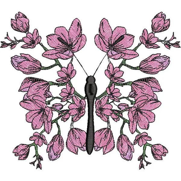 This digital machine embroidery design features a butterfly formed by delicate pink flowers and green leaves. Available in all hoop sizes.