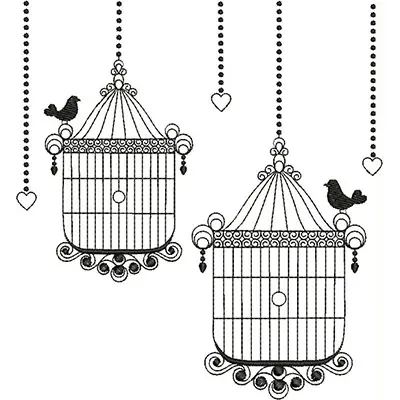 This digital machine embroidery design features two ornate birdcages decorated with playful birds and hanging embellishments. Available for 6X8 hoops.