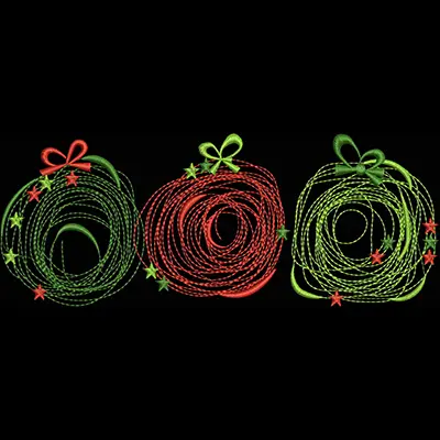 This digital machine embroidery design features three decorative loops made of green and red threads, adorned with bows and small stars. Available for 5X7 hoops.