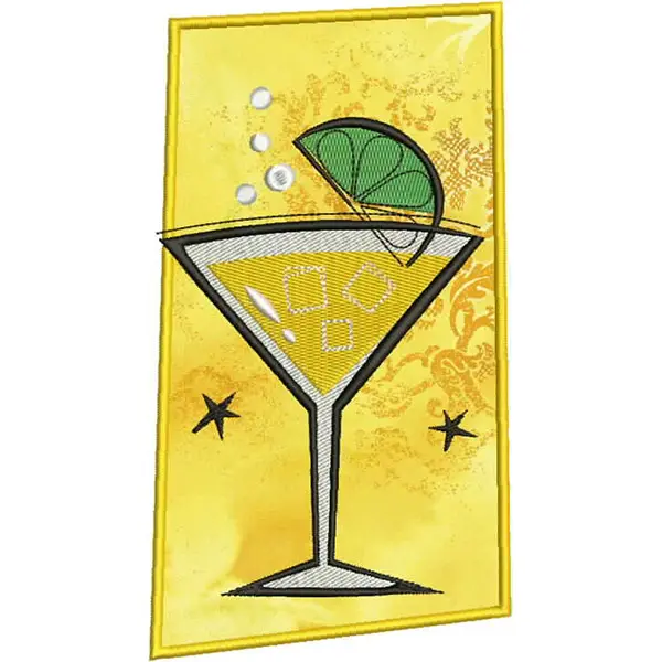 This digital machine embroidery design features a cocktail glass with ice cubes, a lime wedge, and bubbles, framed by a rectangular border. Available in all hoop sizes.