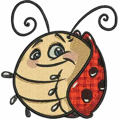 This digital machine embroidery design features a cheerful, cartoonish ladybug with a smiling face and oversized eyes, featuring a red spotted shell and curly antennae. Available in all hoop sizes.
