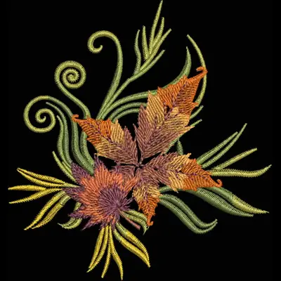 This digital machine embroidery design features intricately colored leaves and delicate swirls, capturing the essence of autumn foliage in rich, warm hues. Available for 4X4 hoops.