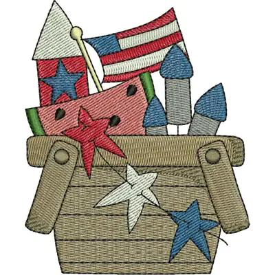 This digital machine embroidery design features a wooden basket filled with festive elements, including firework rockets, a small American flag, and decorative stars. Available for 4X4 hoops.