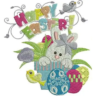 This digital machine embroidery design features a cheerful bunny peeking out from a pastel basket surrounded by colorful eggs and Easter-themed decorations, with the words "Happy Easter!" prominently displayed. Available for 5X5 hoops.