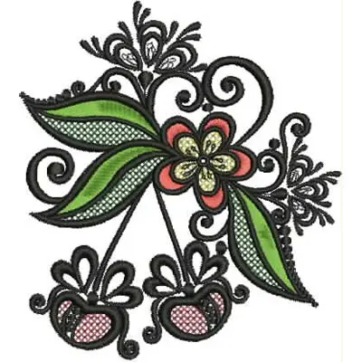 This digital machine embroidery design features flowing floral motifs featuring a central pink flower surrounded by green leaves and decorative elements, with two stylized cherries at the bottom. Available for 5X7 hoops.