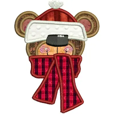 This digital machine embroidery design features a cute bear wearing a red and white striped hat and a plaid scarf. Available for 4X5 hoops.