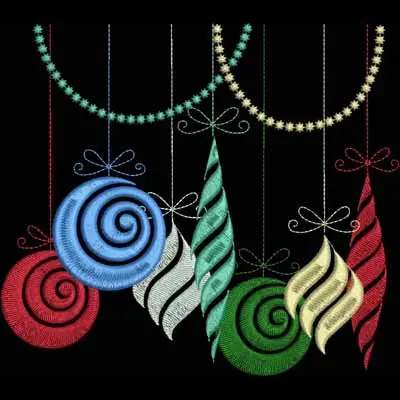 This digital machine embroidery design features colorful hanging Christmas ornaments featuring swirls and stripes in red, blue, green, and white. Available in all hoop sizes.
