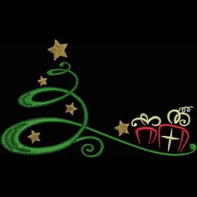This digital machine embroidery design features a whimsical green tree adorned with golden stars and festive red and white gifts. Available for 5X7 hoops.