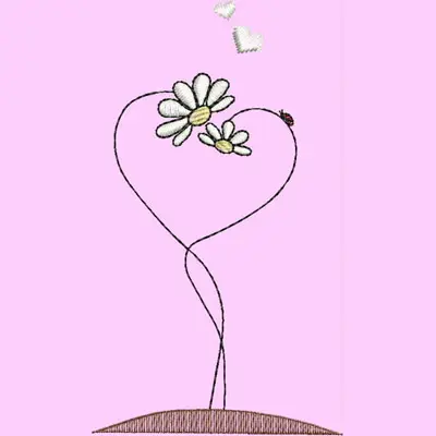 This digital machine embroidery design features two daisies intertwined in a heart shape with a ladybug and small hearts above them. Available for 5X7 hoops.
