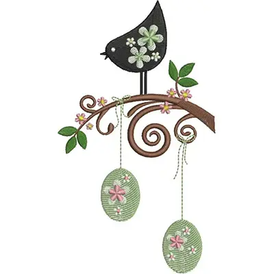 This digital machine embroidery design features a black bird perched on a brown branch with green decorative eggs hanging below and surrounded by pink flowers and leaves. Available for 5X7 hoops.