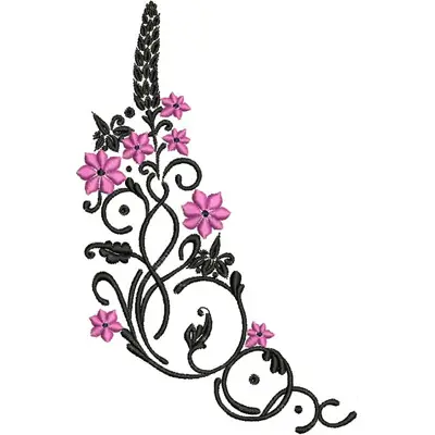 This digital machine embroidery design features an elegant floral arrangement featuring pink flowers and intricate swirling vines. Available for 5X7 hoops.