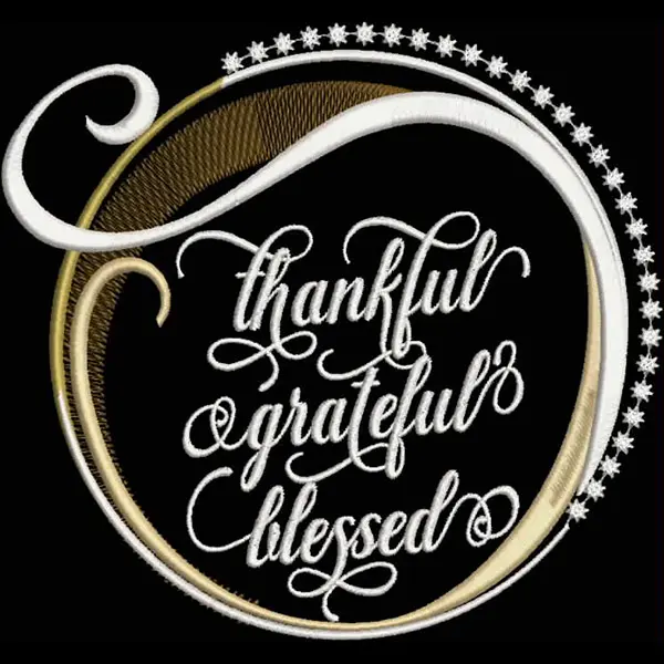 This digital machine embroidery design features the words "thankful," "grateful," and "blessed" artistically arranged in a decorative script. Available in all hoop sizes.