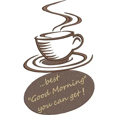 This digital machine embroidery design features a steaming coffee cup above the phrase "…best 'Good Morning' you can get!" in an elegant font. Available for 5X7 hoops.