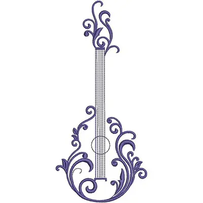 This digital machine embroidery design features a beautifully ornate guitar adorned with intricate swirls and floral patterns. Available for 5X7 hoops.