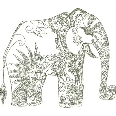 This digital machine embroidery design features an intricately patterned elephant featuring floral and swirling motifs.