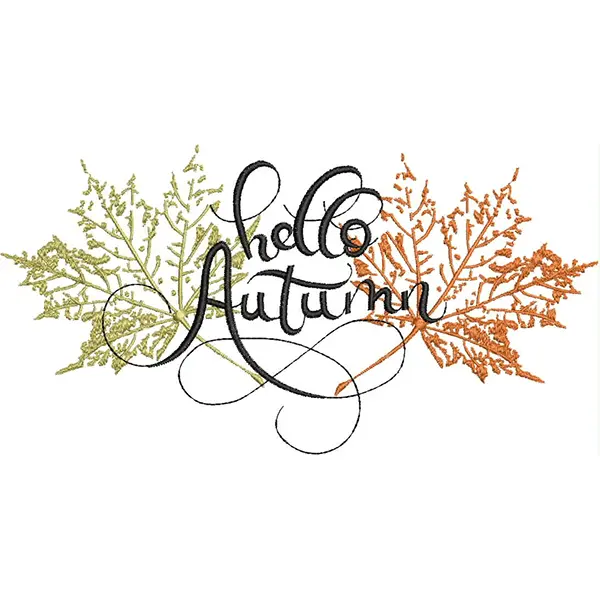 An embroidery design of the phrase “hello Autumn” elegantly intertwined with green and orange leaf motifs..