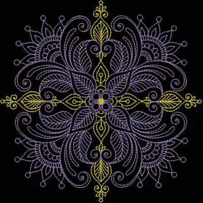 This embroidery design features an intricate floral mandala featuring swirling leaves and delicate details in shades of purple and yellow.
