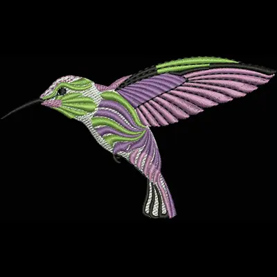 This digital machine embroidery design features a vibrant hummingbird, featuring intricate patterns in shades of green, pink, and black. Available for 4X4 hoops.